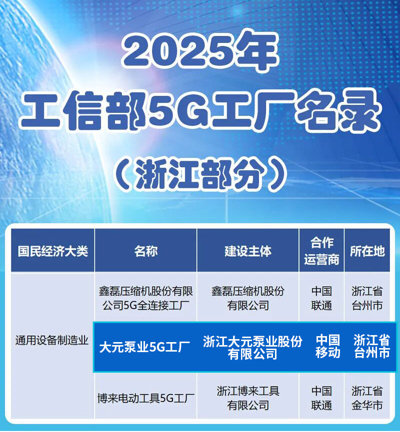近日,工业和信息化部公布了2025年5G工厂名录,浙江大元泵业股份有限公司凭借扎实的建设成效与突出的创新优势成功入选该国家级名单。